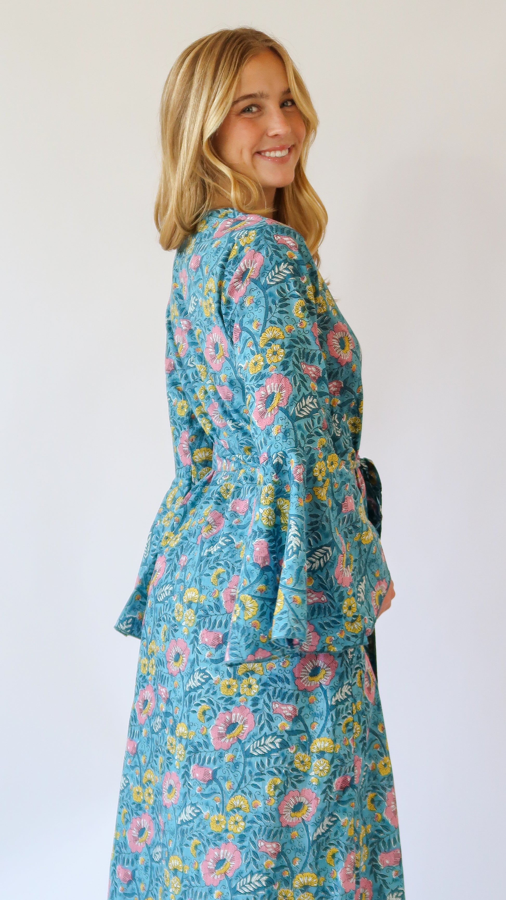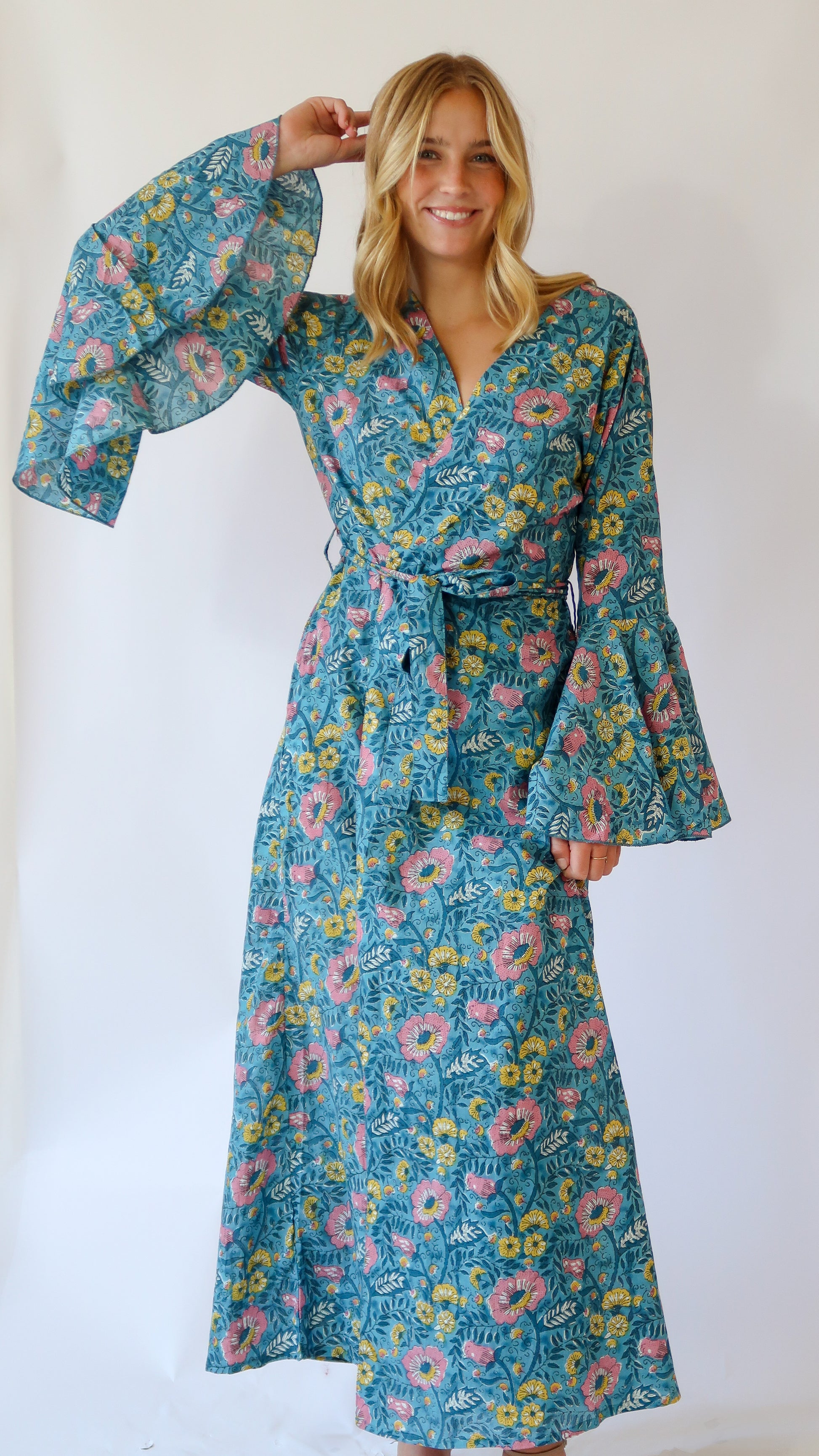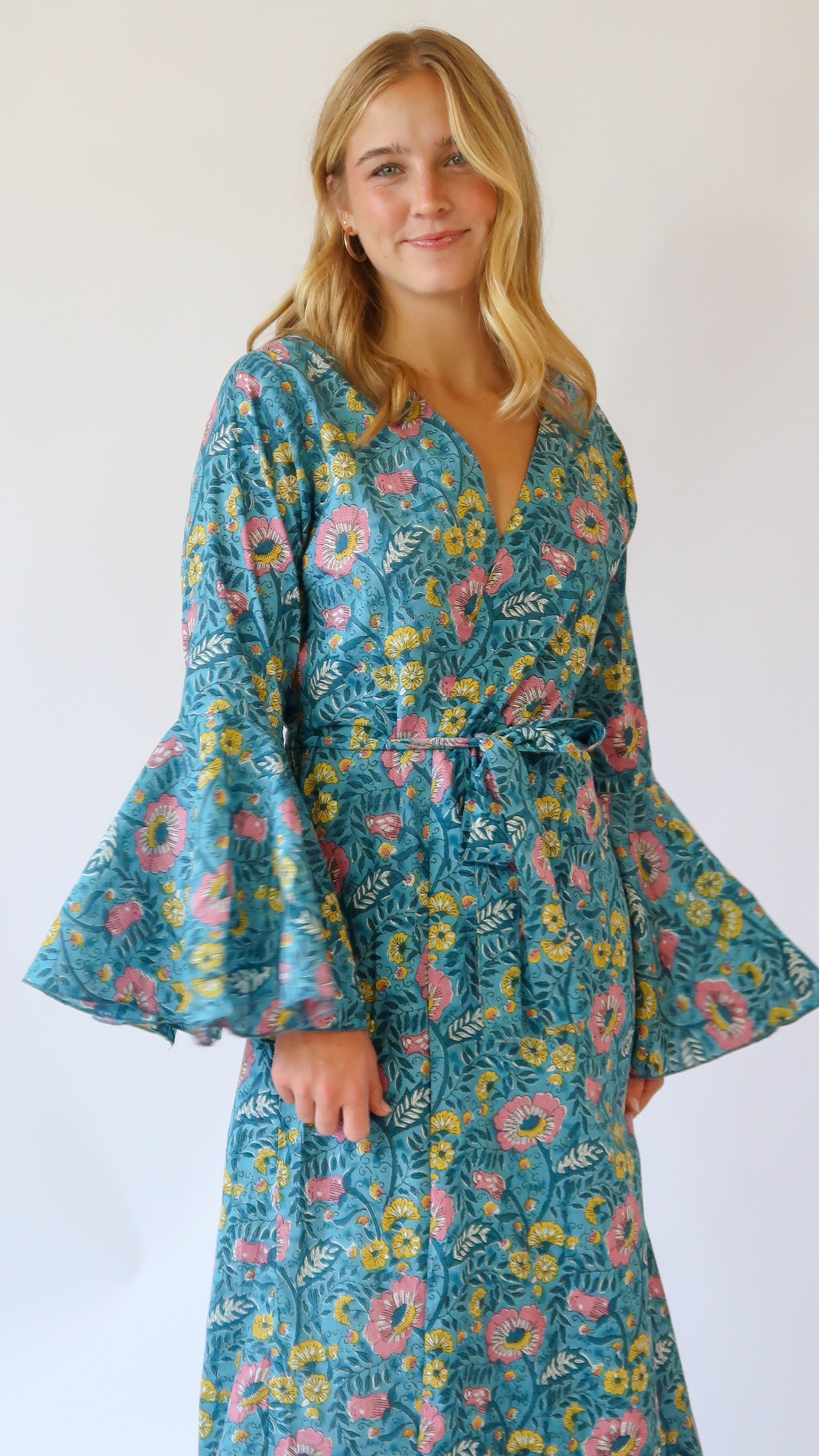 The Robin. A silk blend maxi wrap-dress featuring a wrap top that ties around the body, creating a modest yet flattering fit on top of a ruffled, tapered skirt. The light-weight silk-blend material is a blue print with pink and yellow accents.