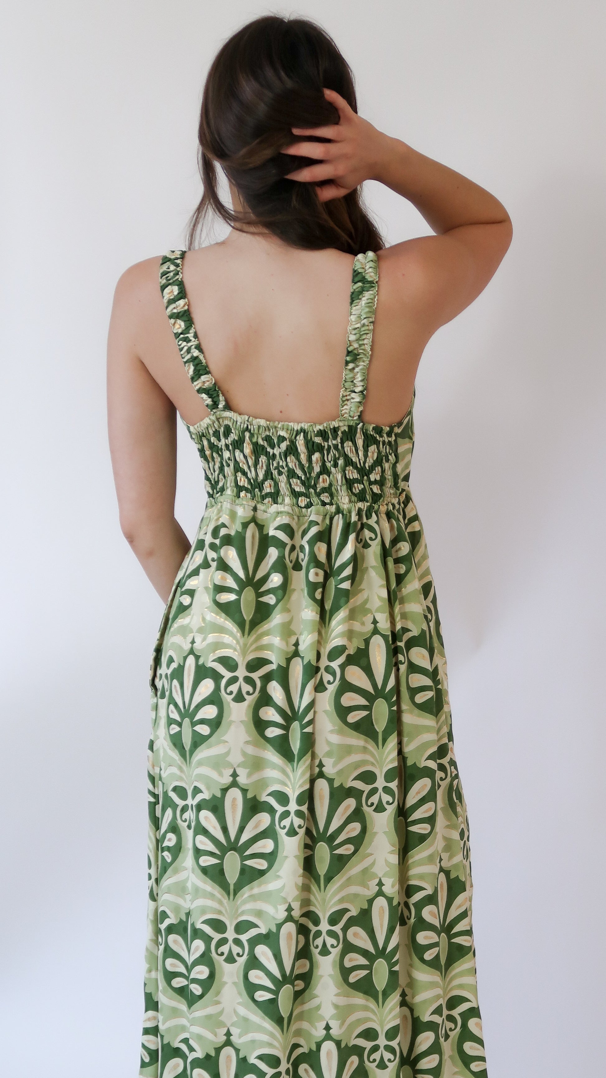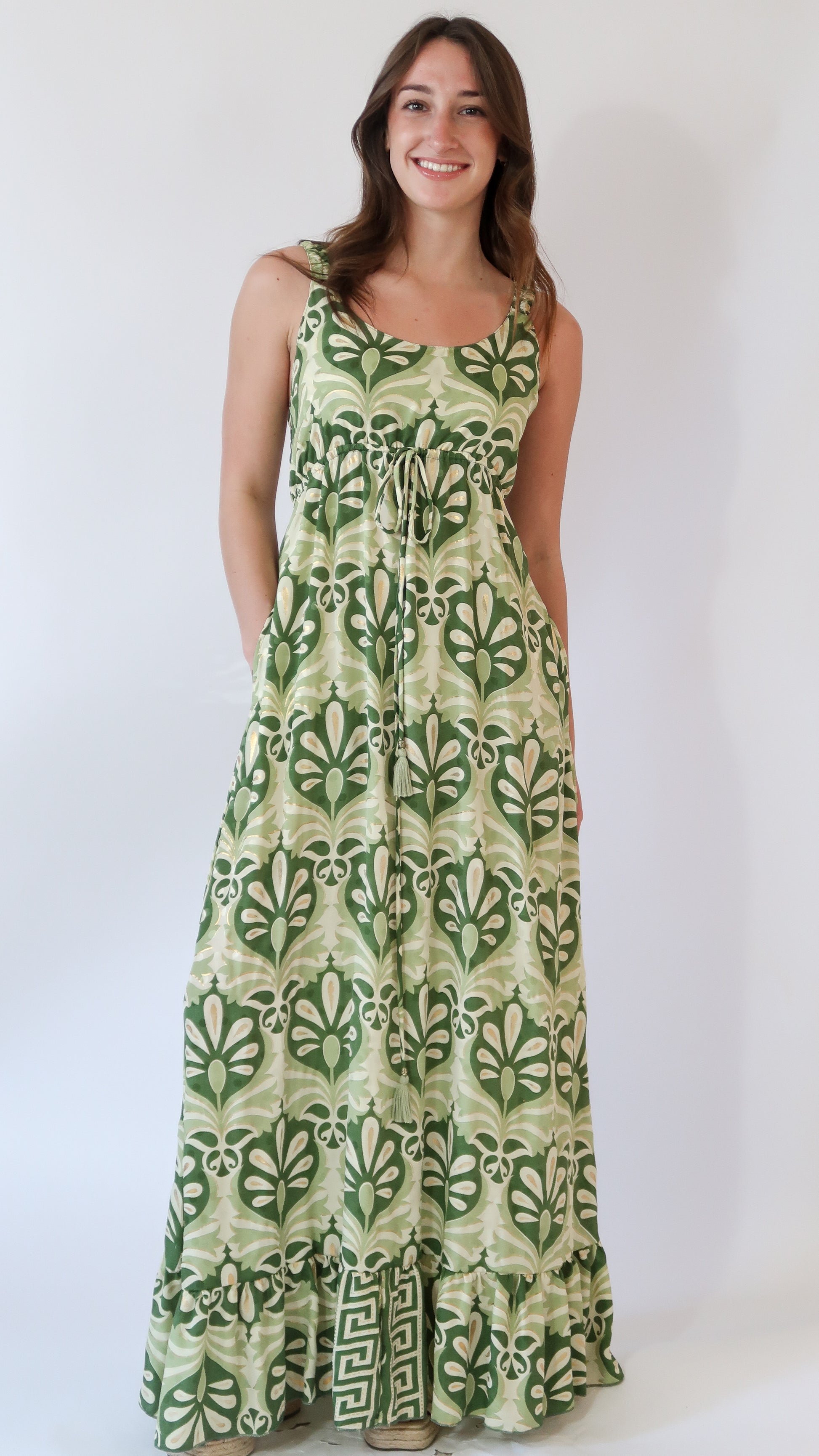 The Greca. A silk-blend maxi dress featuring a flattering straight across neckline and thick, stretchy straps. The dress includes a bold green and white leaf pattern with gold highlights, accented with green tassels. The dress also has convenient pockets.