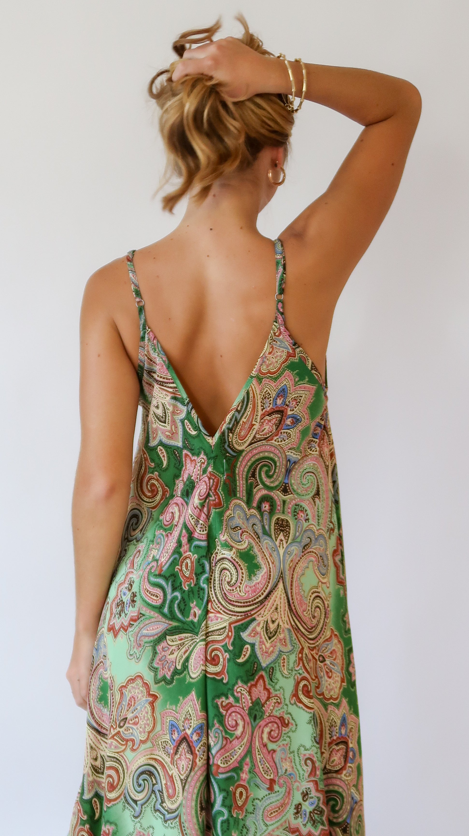 The Jade. A silk-blend maxi dress featuring a flattering triangle top with adjustable straps. The dress has pink and green paisleys that adorn the billowy skirt.
