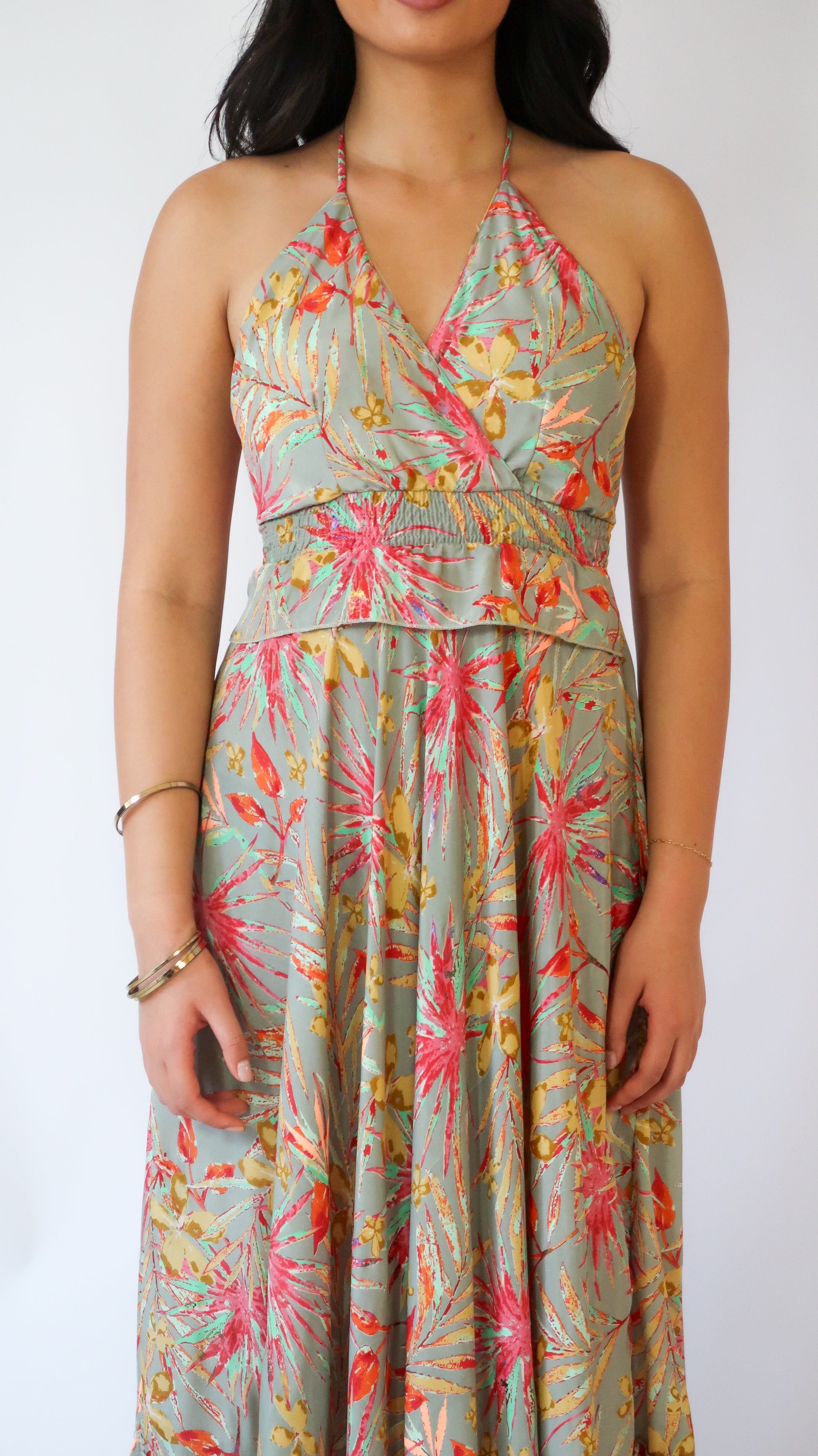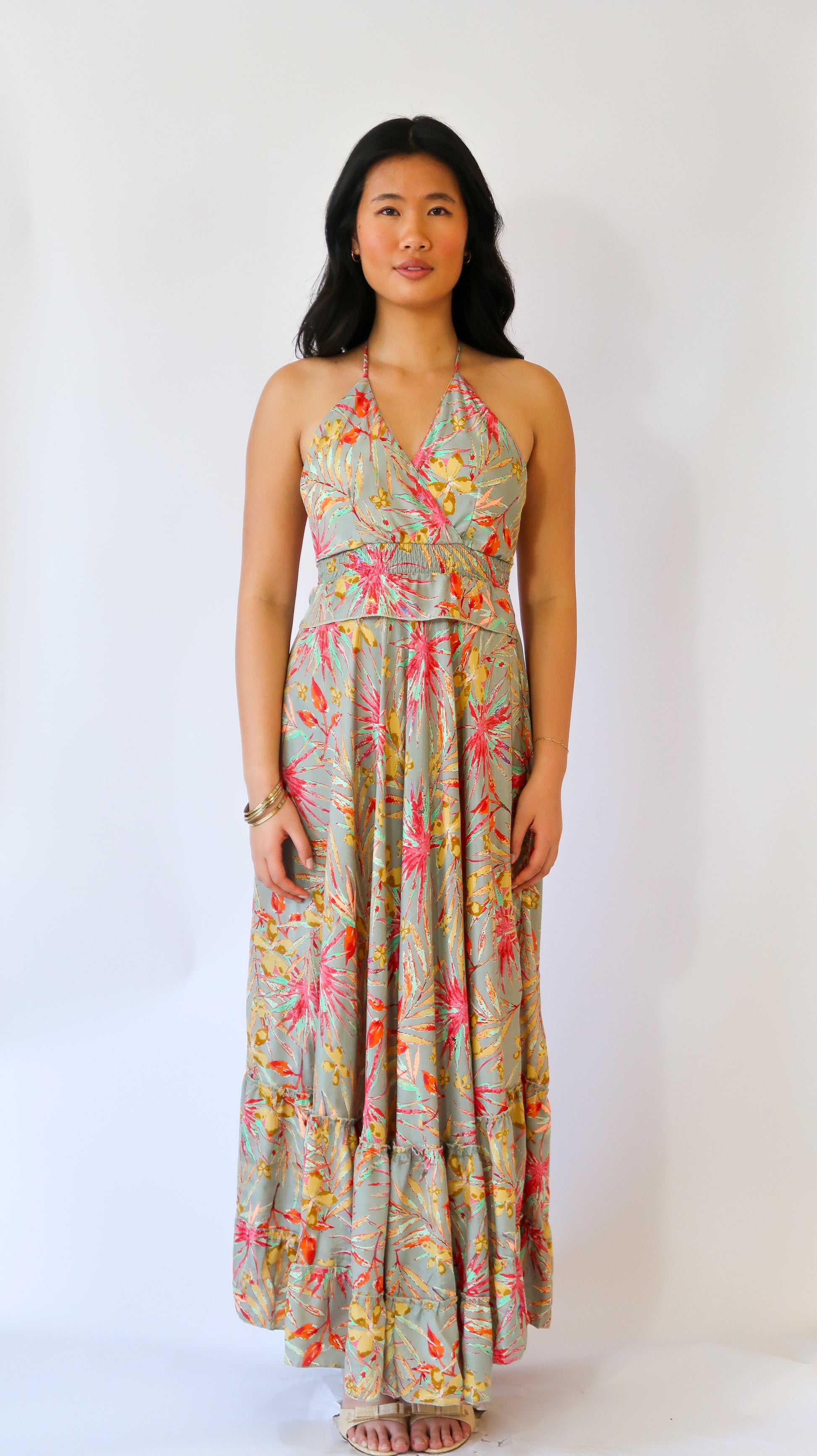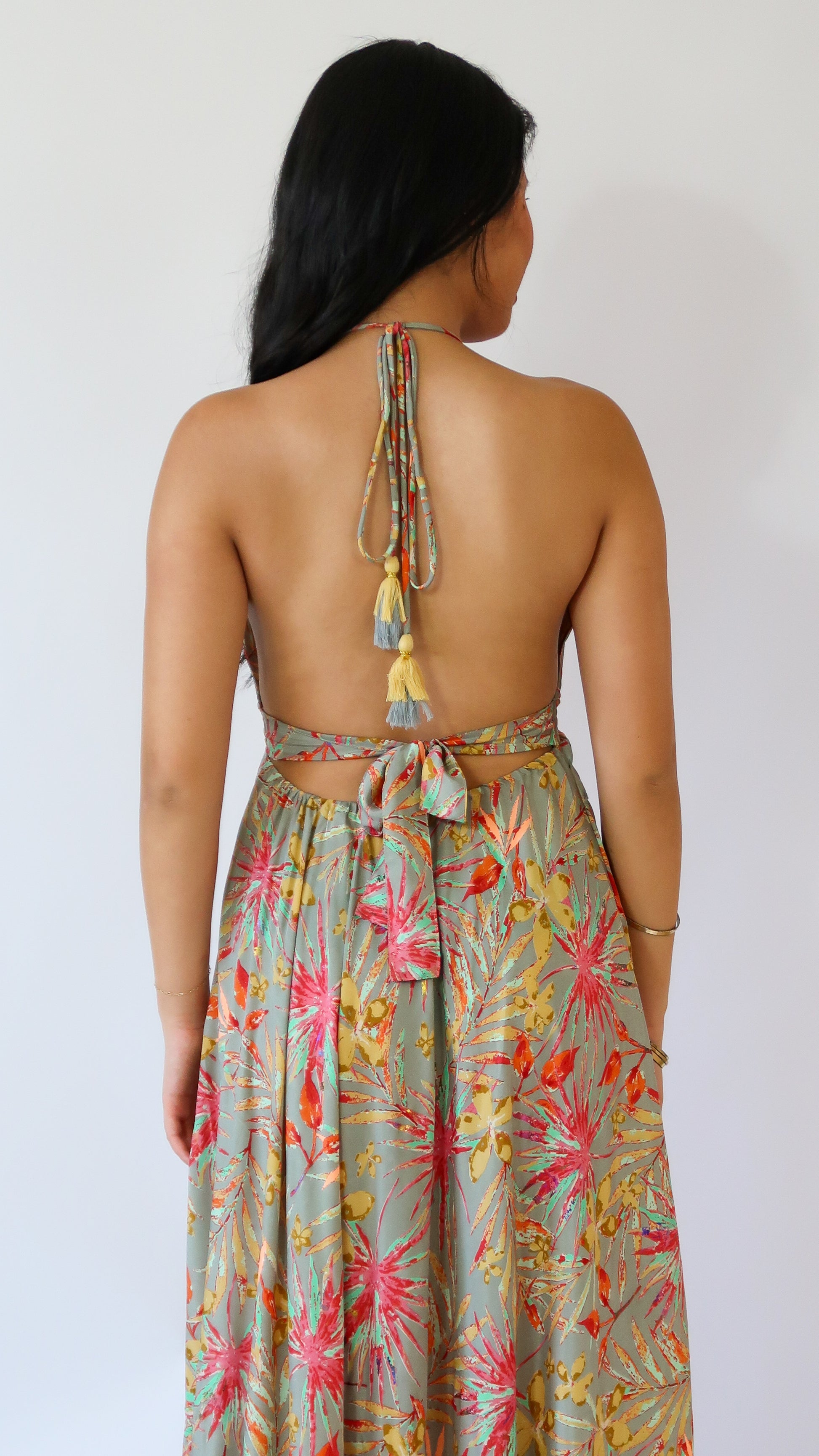 The Jungle. A silk-blend maxi dress featuring a flattering backless top that fastens around the neck and back for a customizable fit, with a fitted center piece accenting the waist. The fabric is a chic grey tone with blue, pink, yellow, and orange plants, adorned with yellow tassels.