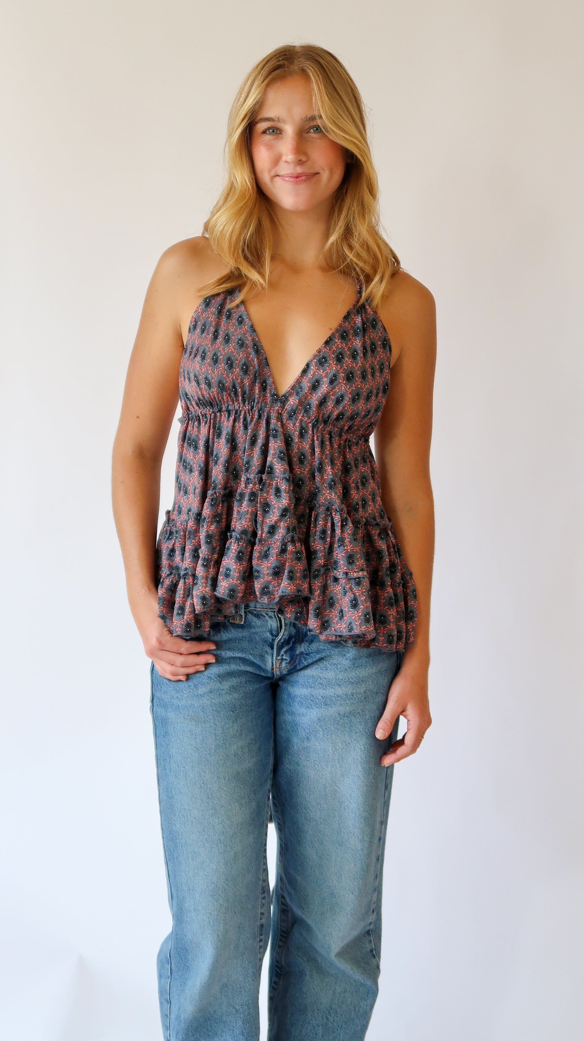 The Tavern. A silk-blend ruffle tank top featuring a flattering triangle top that ties around the neck and bodice for a customizable fit. The top is printed with evergreen trees surrounded by wooden frames.