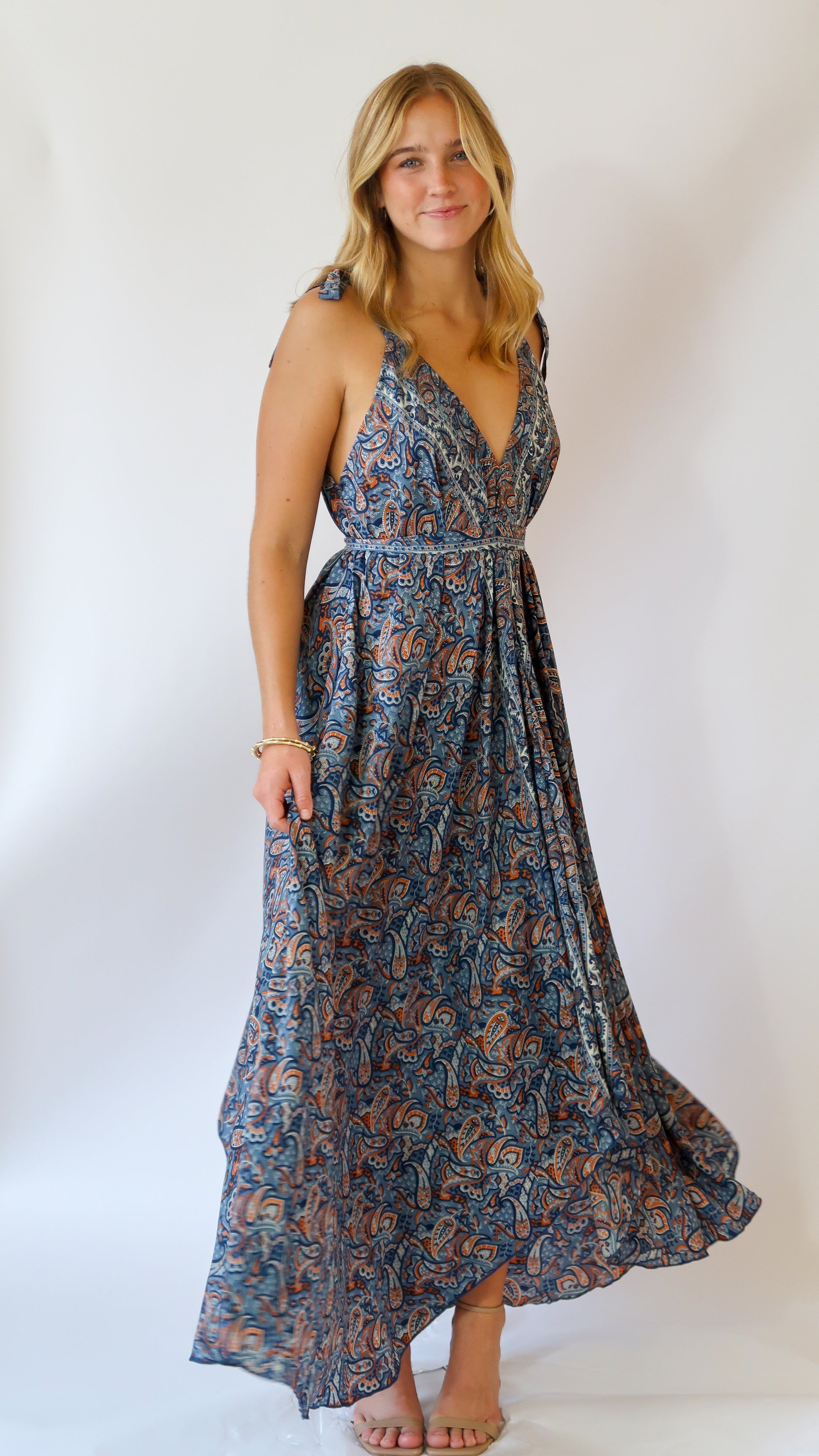 The Paisley. A silk-blend maxi dress featuring a flattering triangle top with straps that tie on each shoulder. The dress is an iridescent blue material adorned with orange and blue paisleys, and the fabric gathers around the waist with a belt.