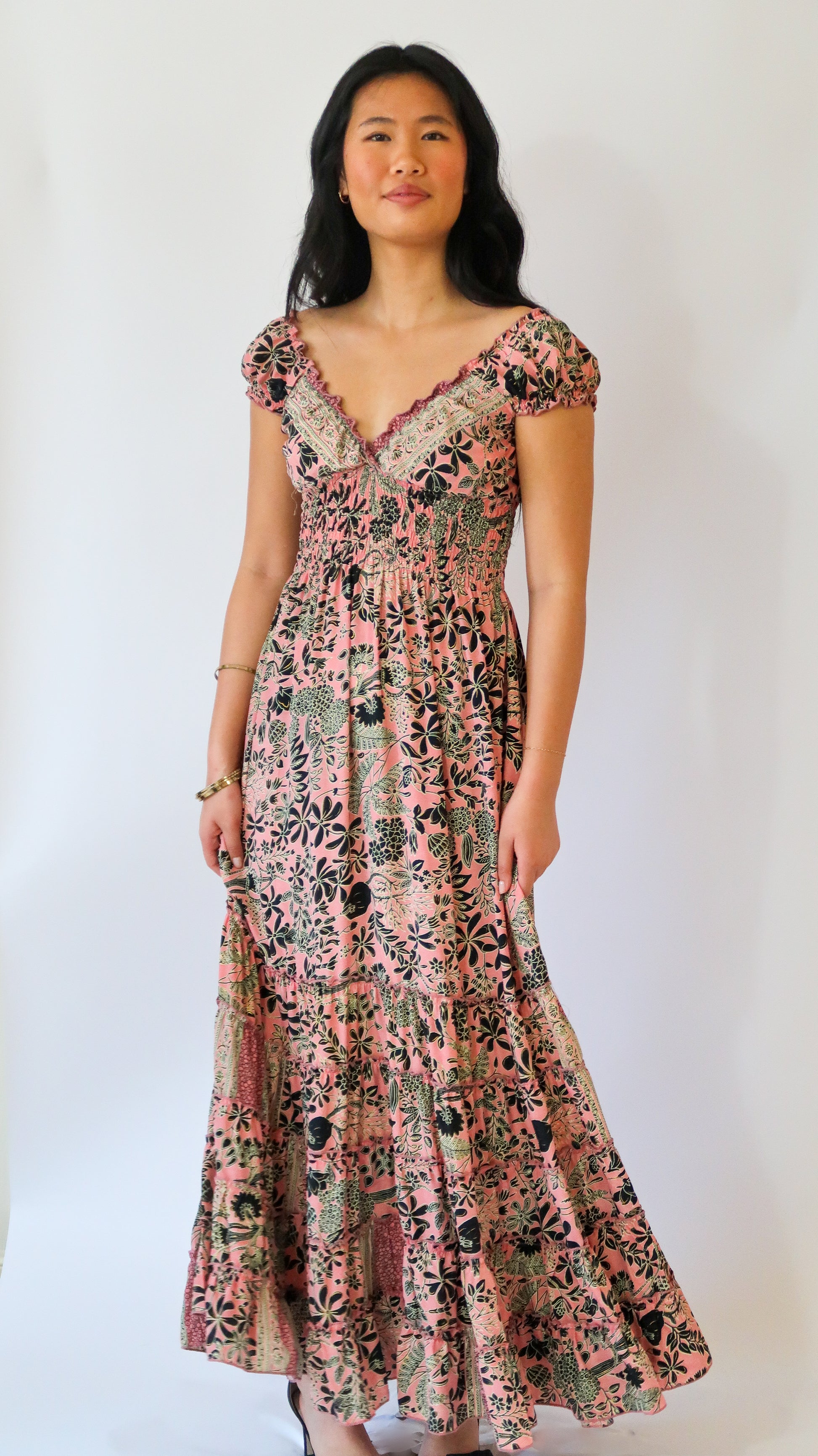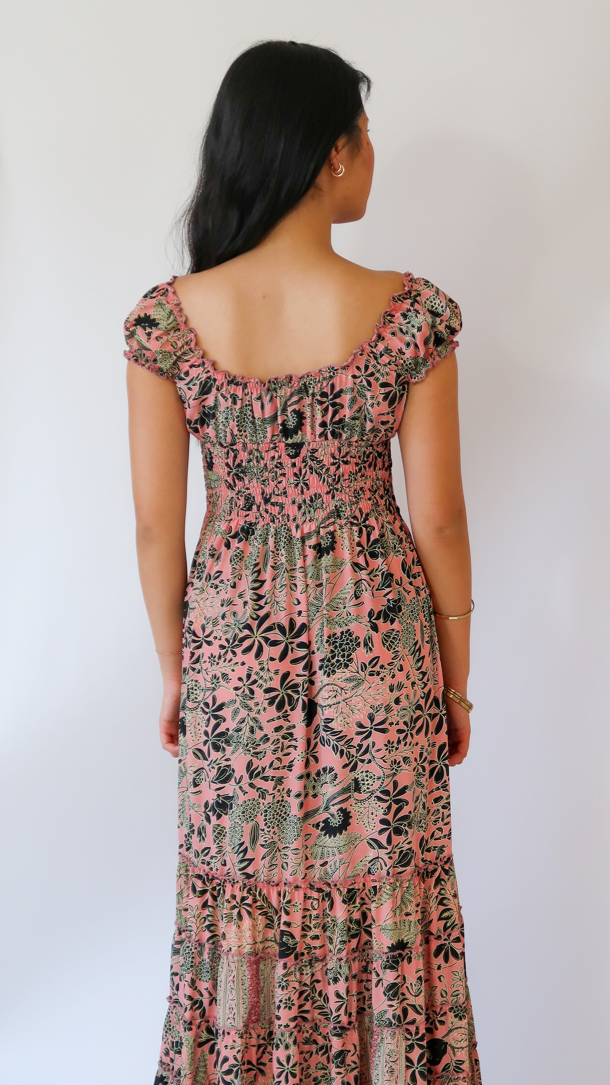 The Himalaya. A silk-blend maxi dress featuring a flattering princess sleeve dress with a cinched waist piece. The dress is a soft pink base with black and dark green florals.