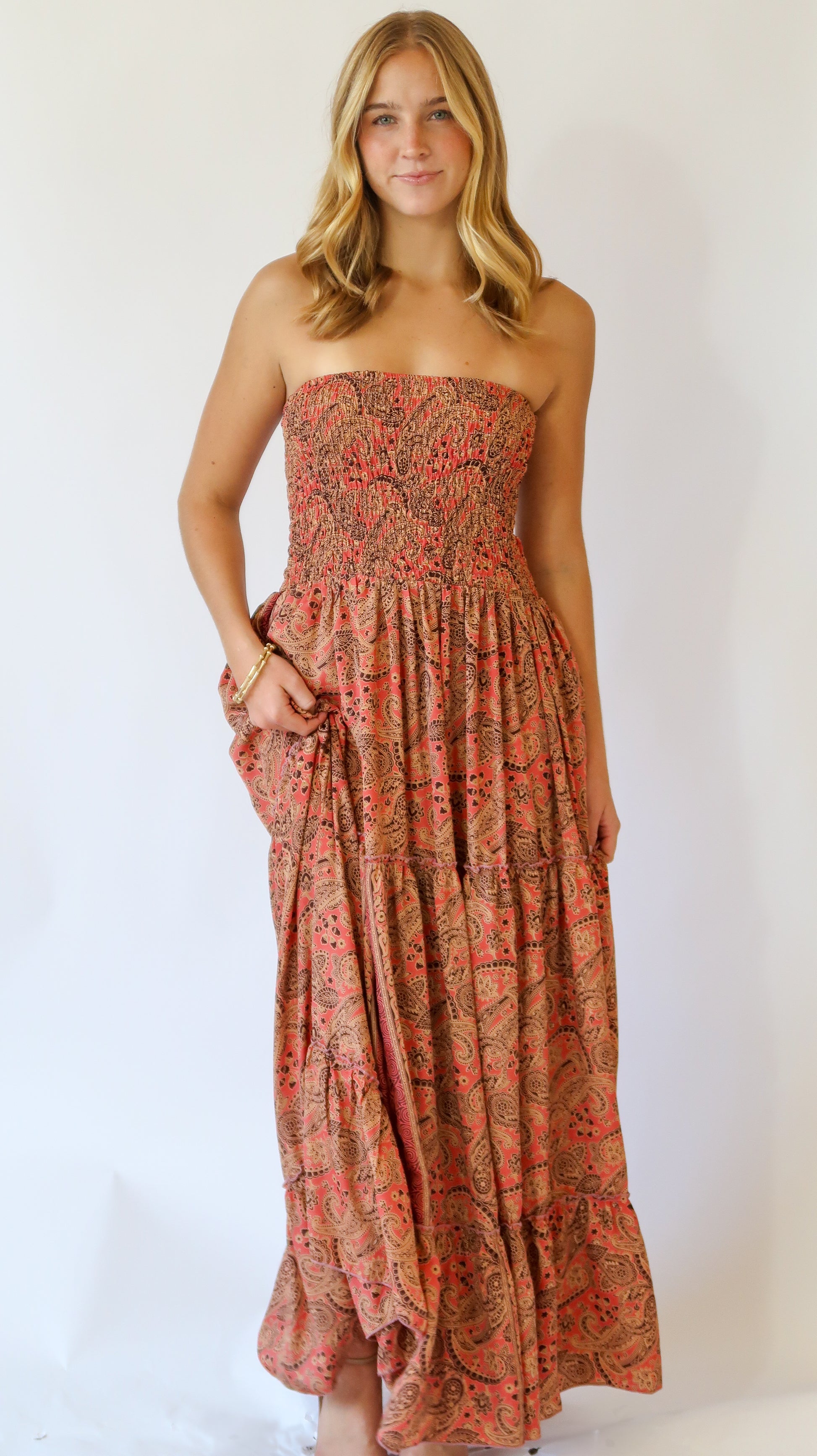 The Tigress. A silk-blend maxi dress featuring a flattering, adjustable top and flowy, multi-tiered skirt. The dress is a printed on a bright pink background with black paisleys.
