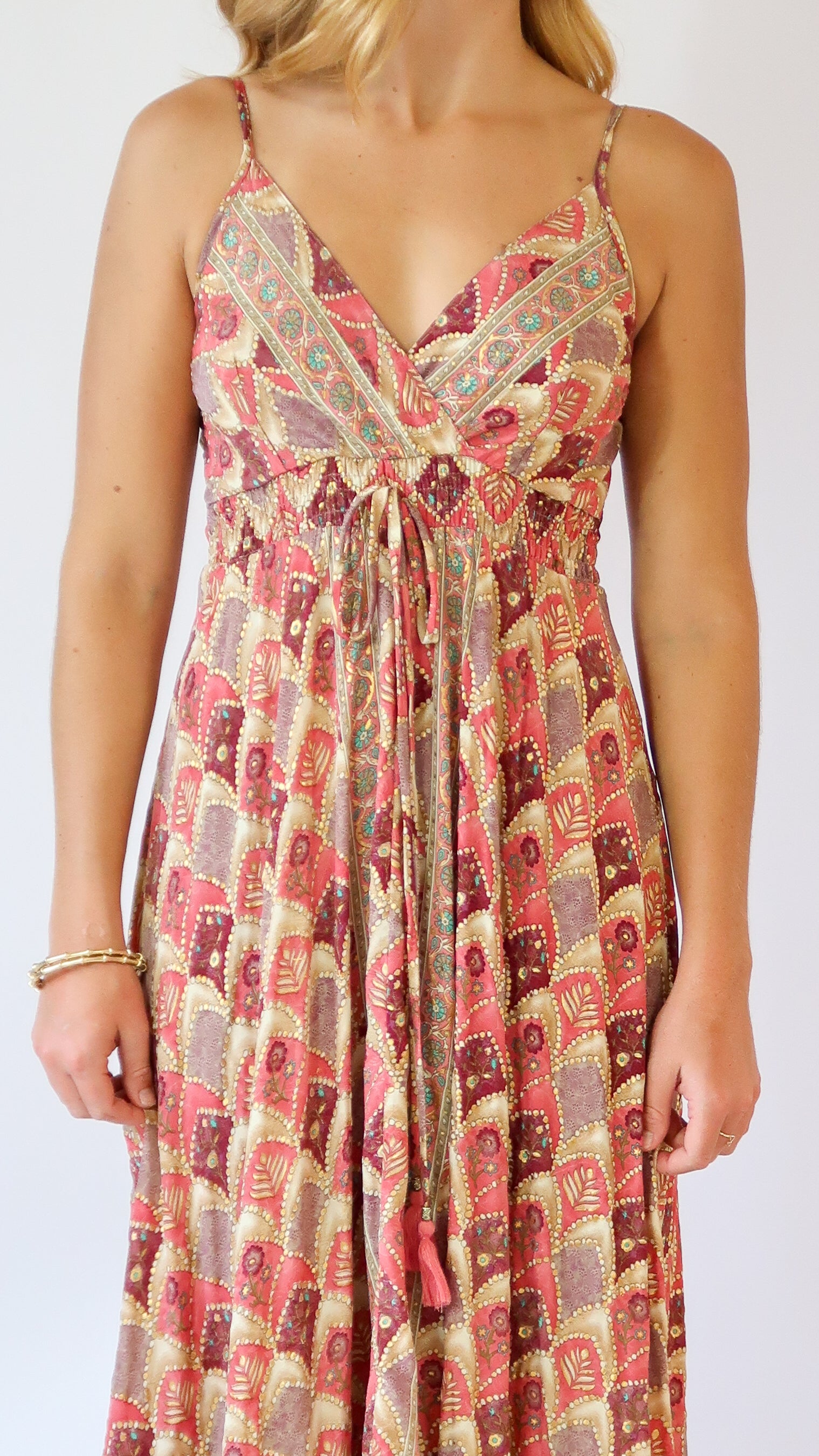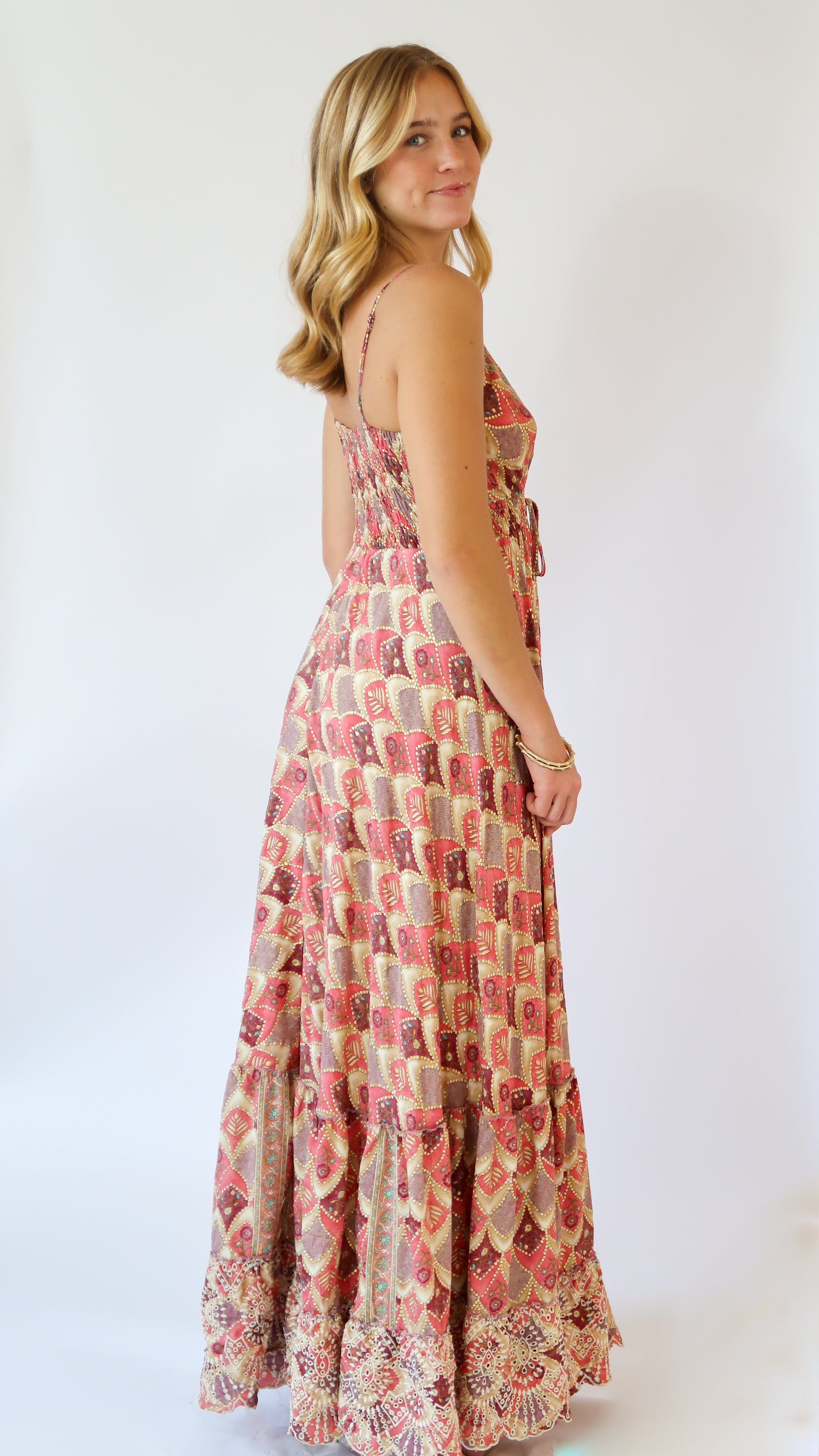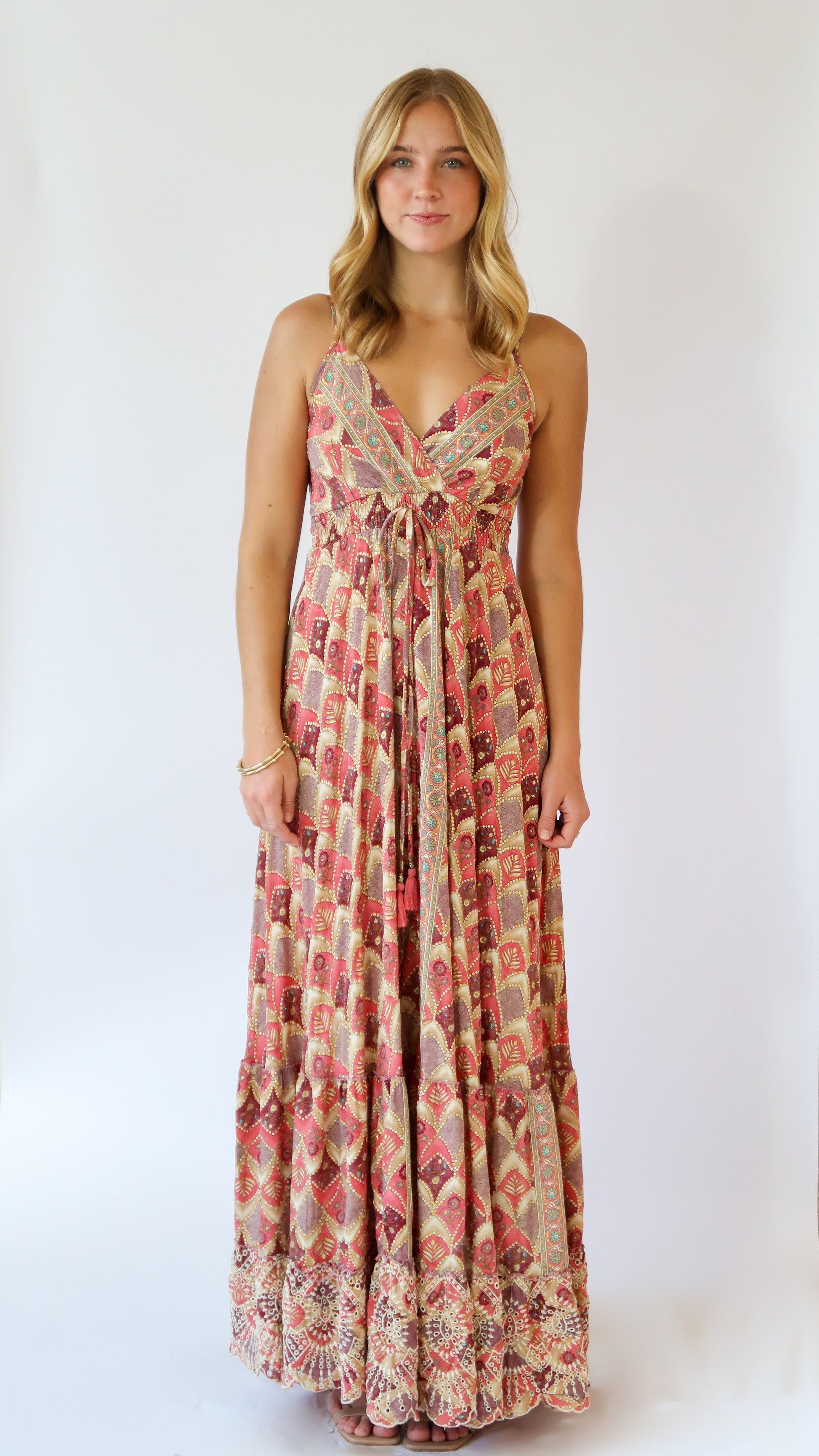 The Goddess. A silk-blend maxi dress featuring a flattering, adjustable triangle top and flowy, multi-tiered and layered skirt finished with a heavy lace bottom later. The fabric is a traditional pink and maroon triangle print with bright blue accents, and the dress is adorned with maroon tassels.