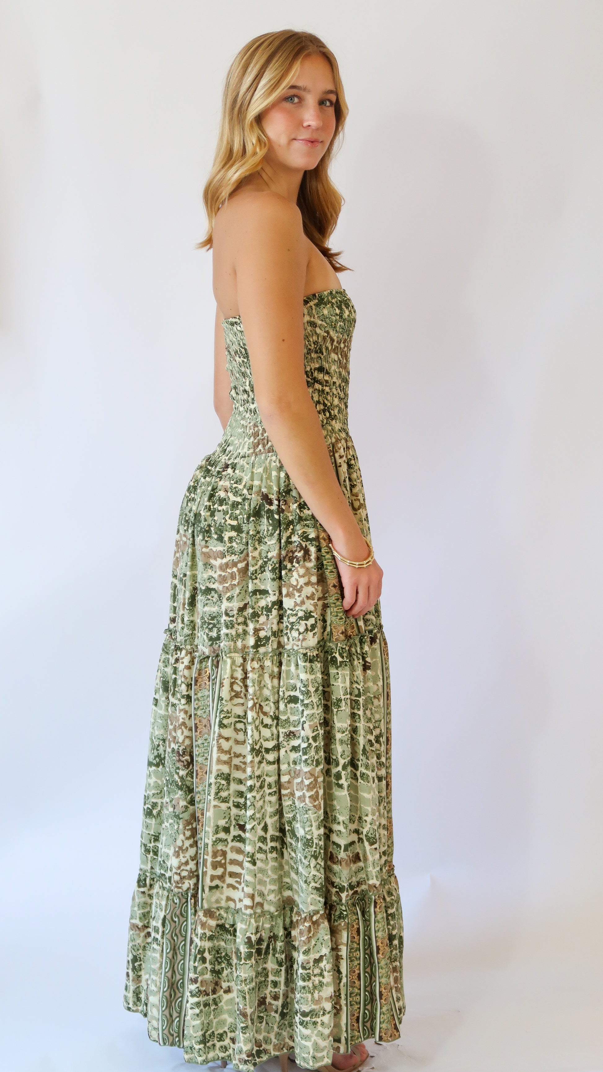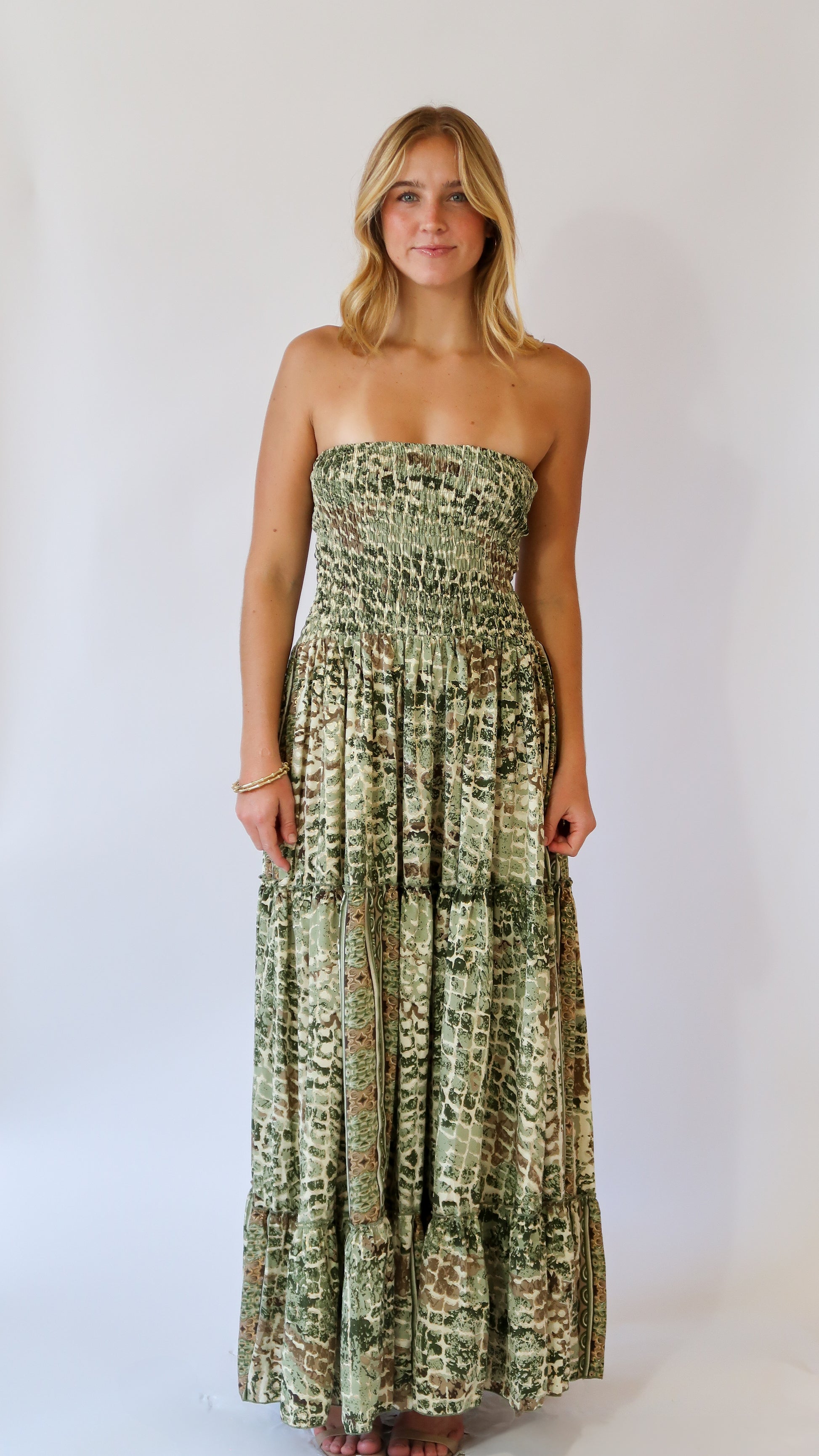 The Cobra Strapless. A silk-blend strapless maxi dress featuring a flattering, adjustable top and flowy, multi-tiered skirt. The dress is our signature snake skin pattern.